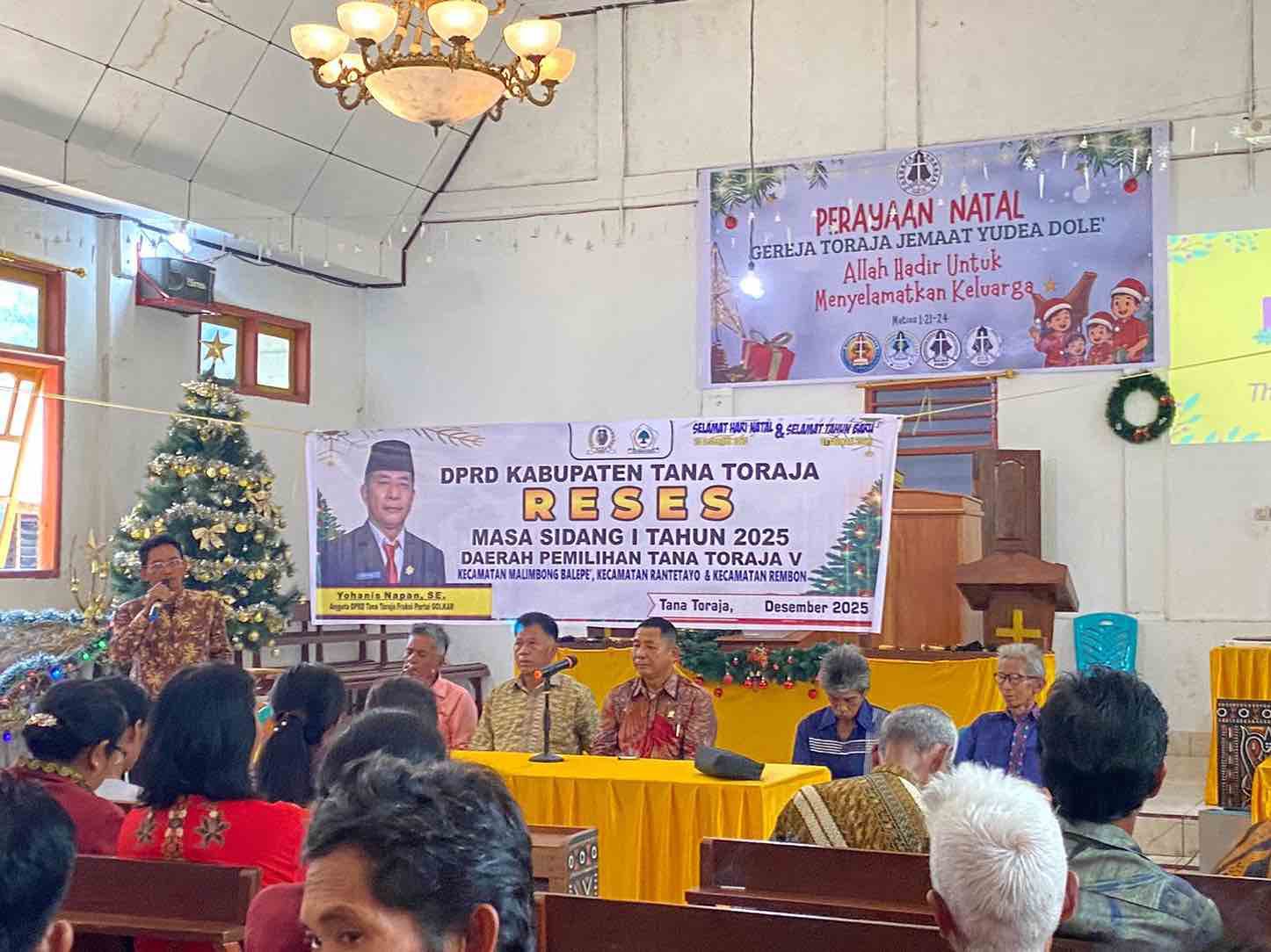 MAKALE, – Reses DPRD Tana Toraja masa sidang I tahun 2025 Yohanis Napan SE dilakukan dalam sebuah pertemuan di gedung Gereja Toraja Jemaat Dole’ Tapparan Kecamatan Rantetayo Minggu 14 Desember 2025. Legislator Golkar ini selain serap aspirasi juga mulai gencar sosialisasikan peraturan daerah di dapilnya.