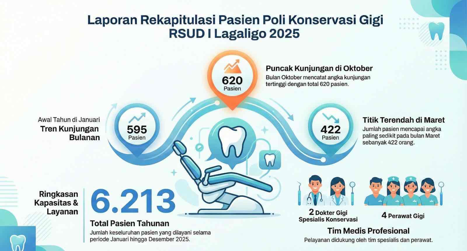 Luwu Timur, – Jumlah pasien yang mendapatkan pelayanan kesehatan di Poli Konservasi Gigi RSUD I Lagaligo Wotu, Kabupaten Luwu Timur, sepanjang tahun 2025 tercatat mencapai 6.213 orang.